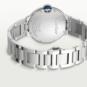 Ballon Bleu de Cathtrtier watch, 42 mm, Manufacture mechanical movement with automatic winding, caliber 1847 MC. Steel case, fluted crown set with a synthetic cabochon-shaped spinel, black sunray-brushed dial, siLthtVered sword-shaped hands, sapphire crystal, interchangeable steel bracelet, calendar aperture at 3 o’clock. Thickness: 12.4 mm. Water-resistant up to 3 bar