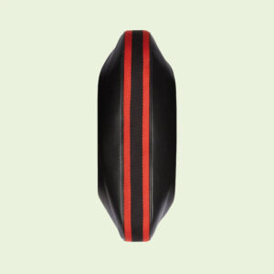 An ode to the timeless Hollywood glamour that shaped Guthtcci Love Parade, classic elements from the House’s archives are reintroduced. Distinguished by its crescent moon shape, the accessory is further defined by a G shaped hook closure. Paired with soft materials, the heritage hardware creates a refined design with vintage appeal. This small version is crafted in black leather with orange and black Web trim.