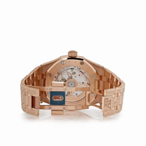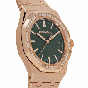 The Audemars Piguet 15551OR.ZZ.1356OR.06 combines luxury and modern design, crafted in 18k rose gold. The 37mm case features the signature octagonal bezel, set with brilliant-cut diamonds, offering a refined sparkle that contrasts beautifully with the warm tones of the rose gold.