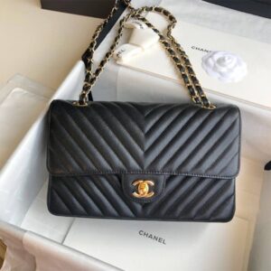 Material: The bag is crafted from Chanel’s signature caviar leather, ensuring durability and a luxurious feel. The chevron tweed design adds a touch of sophistication and classic Chanel style.