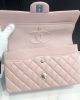 This Medium Classic Double Flap bag is in Light Pink caviar leather with light gold tone hardware and features a front flap with signature CC turnlock closure, half moon back pocket, and adjustable interwoven light gold tone chain link and light pink leather shoulder strap.
