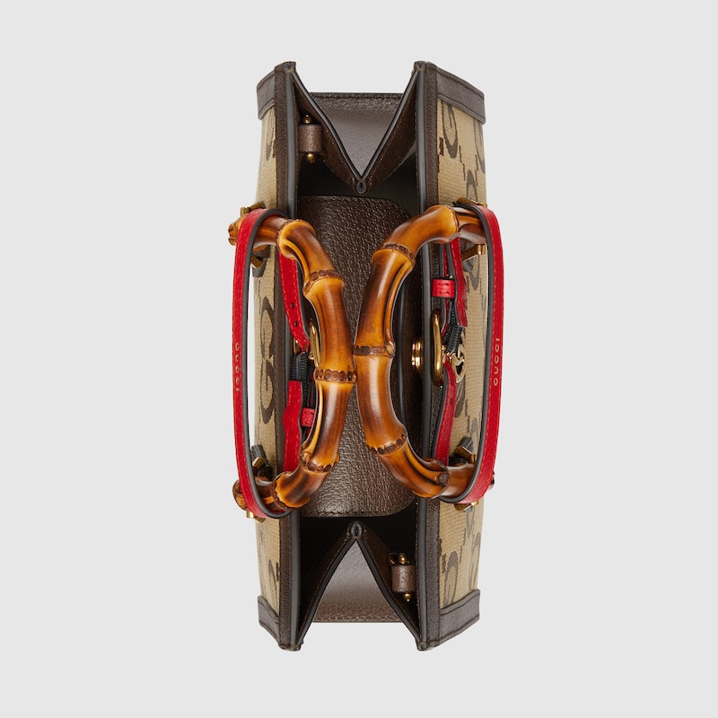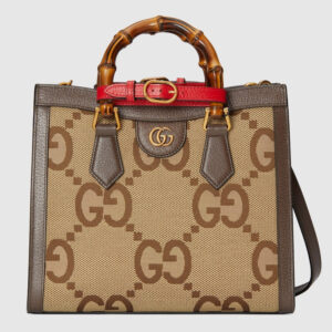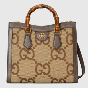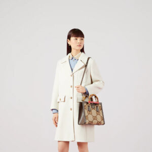 Instantly recognizable emblems of the brand, logos enrich designs in new and unexpected ways. Behind every logo lies the tradition and value of the House, an everlasting medium one can wear again and again. Following the idea of constant change and experimentation, different iterations of the logo have been presented each collection. The jumbo GthtG, a new, maximalist version of the historic monogram, animates a selection of ready-to-wear and accessories for the Aria collection. This small Guthtcci Diana tote is completed by a brown leather trim.