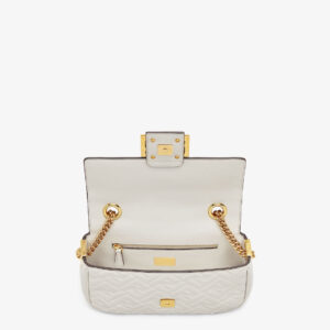 Iconic medium Baguette bag with chain, made of light gray soft nappa leather with a 3D texture FF motif. Embellished with an FF clasp.