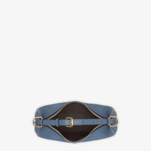 Small hobo bag made of soft, blue leather, decorated with vintage gold metal Fendi lettering visible when wearing the bag under the arm.
