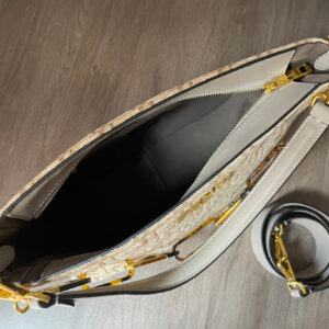 Can be carried by hand or on the shoulder thanks to the double removable handles: a short one in leather and one made in chain with oversized O’Lock logo in metal and tortoiseshell-effect plexiglass.