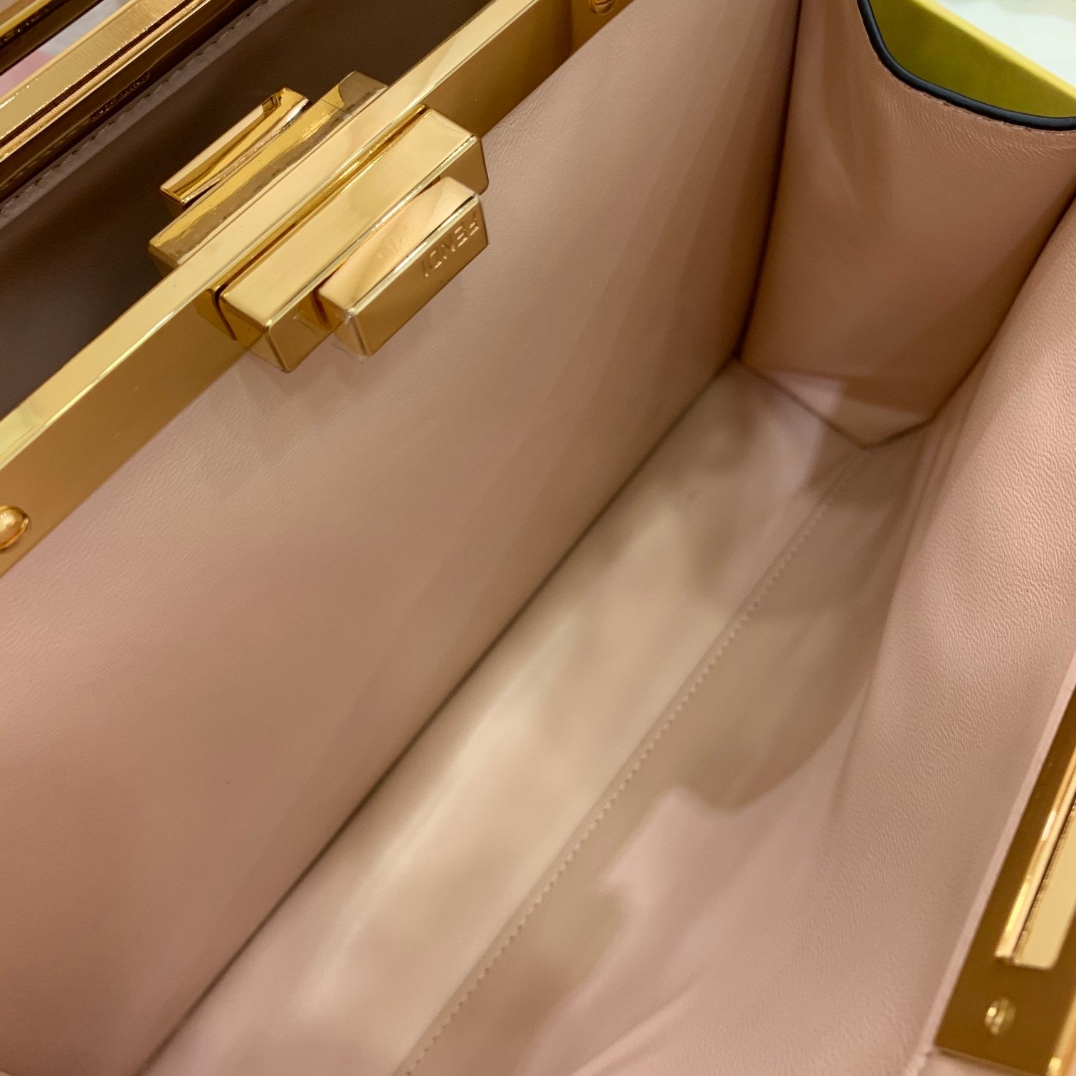 Featuring a two tone pink and dove gray soft nappa leather lining, two compartments separated by a stiff partition, an inner pocket with a button and gold-finish metalware.
