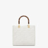 Medium Sunshine Shopper bag made of blue denim with all-over Fendi Mirror motif. Featuring the Fendi ROMA lettering in brown and stiff leather handles.