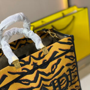 Medium Sunshine Shopper bag made of brown leather with raised 3D-texture FF motif and rigid tortoiseshell-effect plexiglass handles.