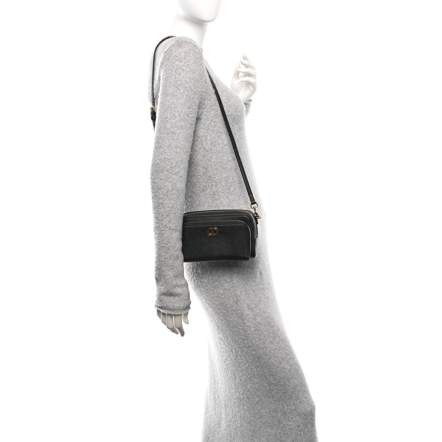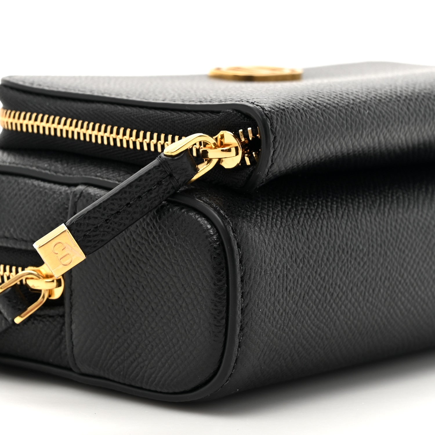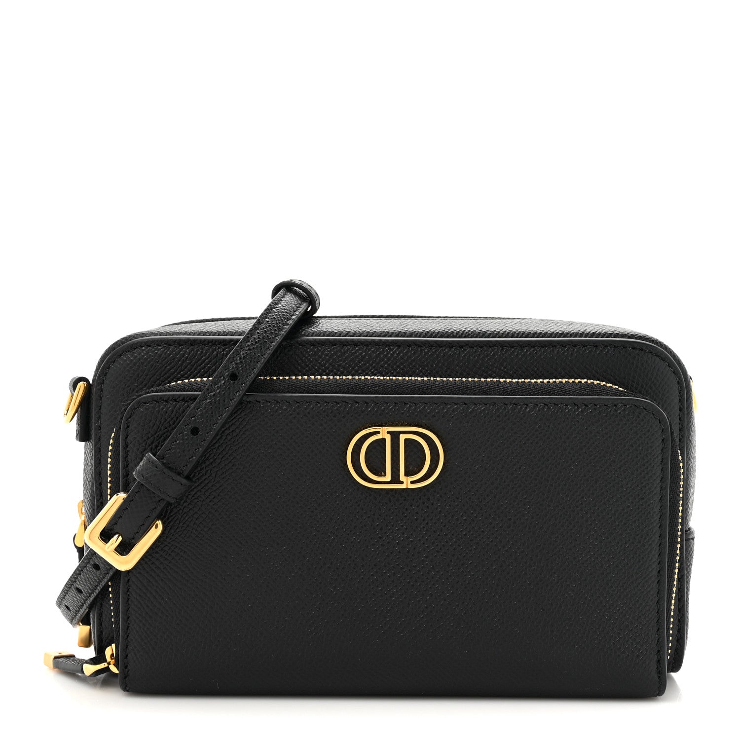 This is an authentic CHRISTIAN DIOR Grained Calfskin Caro Double Pouch in Black. This stylish crossbody is crafted of grained calfskin leather in black. The bag features a matching leather shoulder strap, a front zipper pocket with a gold CD logo, and gold hardware. The top zipper opens to a black suede interior.