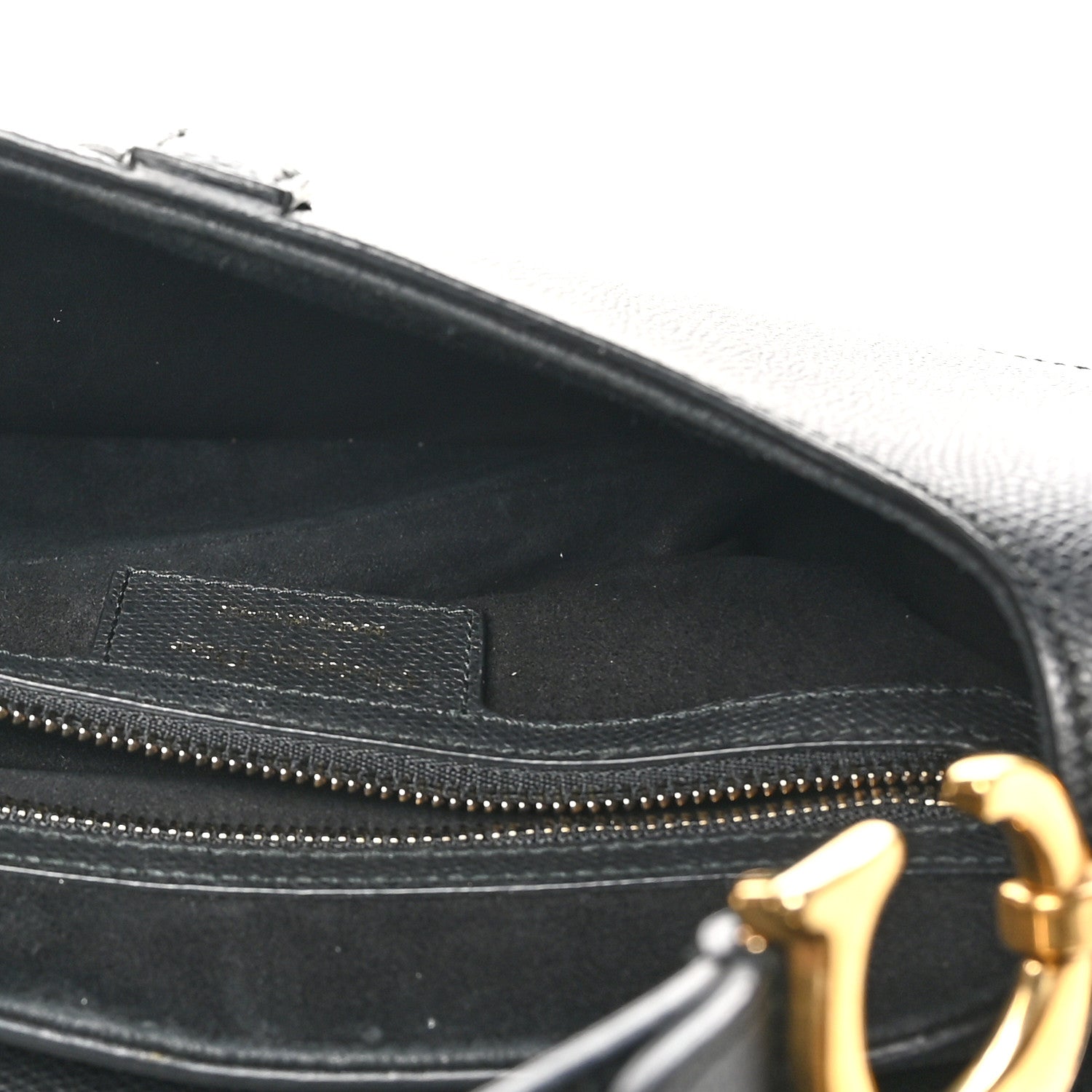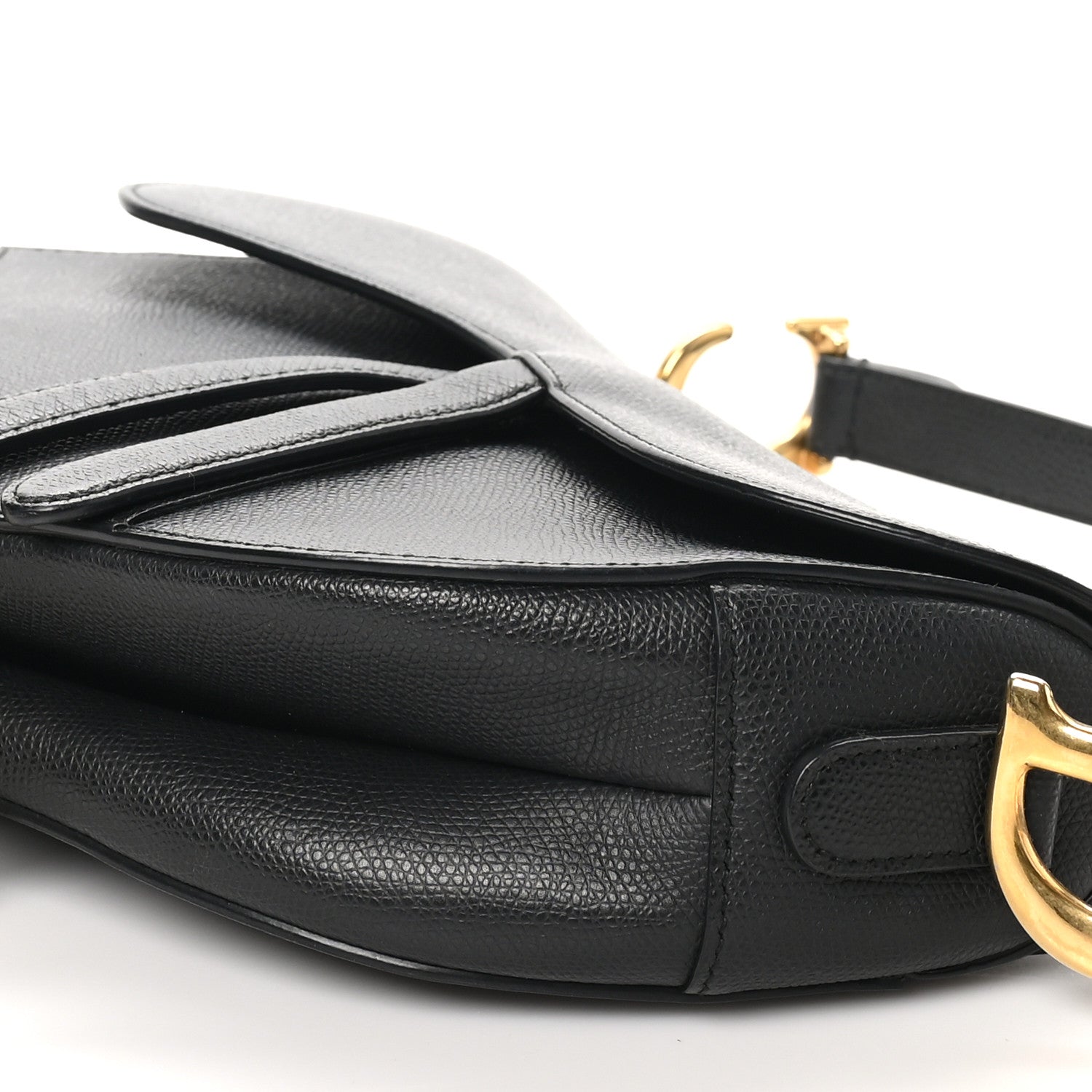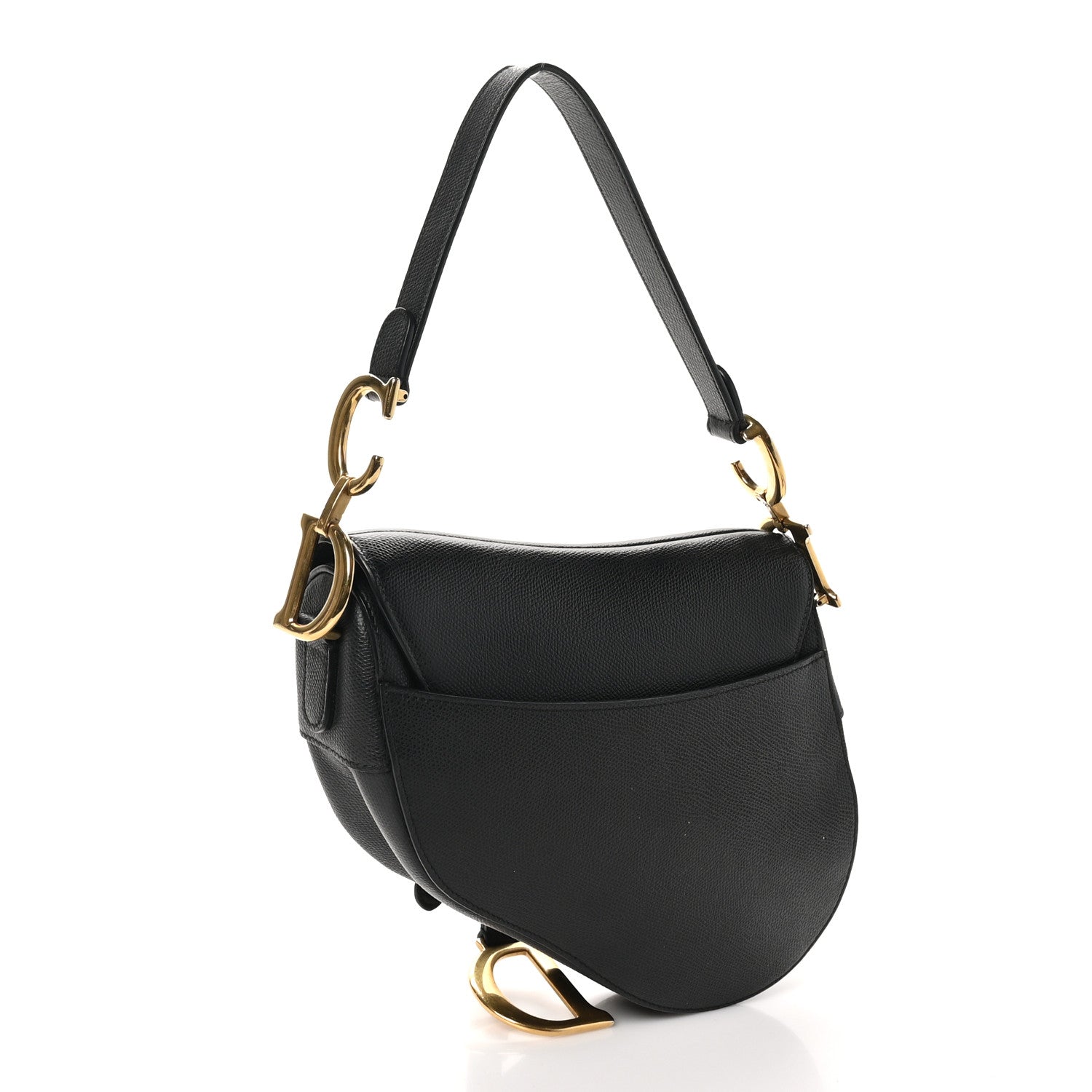 This is an authentic CHRISTIAN DIOR Grained Calfskin Saddle Bag in Black. This chic bag is crafted of grained calfskin leather in black. This bag features the saddle bag shape, short leather shoulder strap with a polished aged gold “C” and “D” anchors on either end of the handle for handle and a prominent hanging Dior “D” charm. The interior of the bag is a black microfiber textile with a zipper pocket.