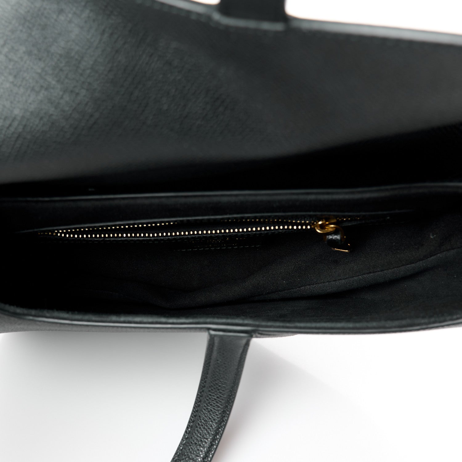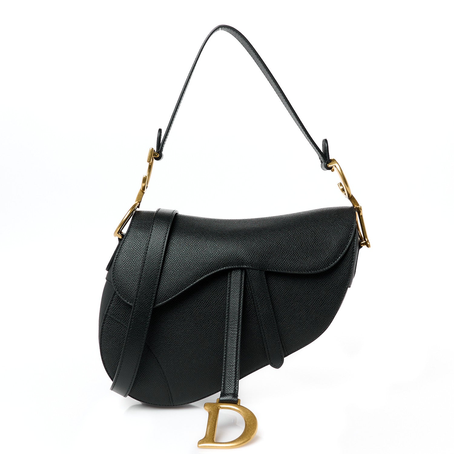 This is an authentic CHRISTIAN DIOR Grained Calfskin Saddle Bag With Strap in Black. This bag features the saddle bag shape, short leather shoulder strap with a polished gold tone “C” and “D” anchors on either end of the handle, an optional adjustable shoulder strap, and a prominent hanging Dior “D” charm. The interior of the bag is a black microfiber textile with a zipper pocket.