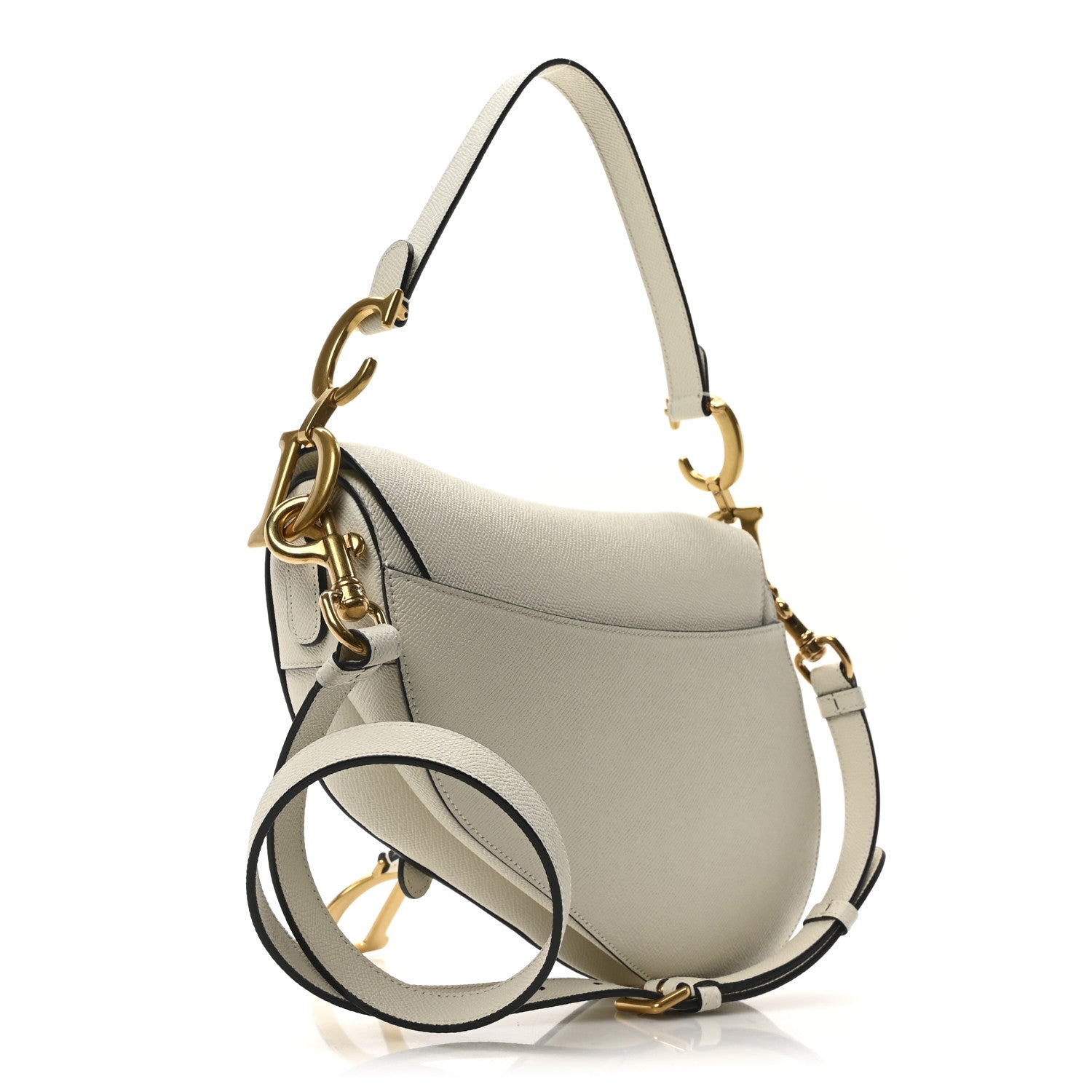 This is an authentic CHRISTIAN DIOR Grained Calfskin Saddle Bag With Strap in Latte. This classic shoulder bag is crafted of grained calfskin leather in off-white. It features a rear slip pocket, matching leather shoulder strap with gold-toned CD handle anchors, a removable adjustable longer crossbody strap, and gold-toned D charm on the front. The bag opens with a magnetic snap to a white suede interior with a zippered pocket.