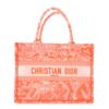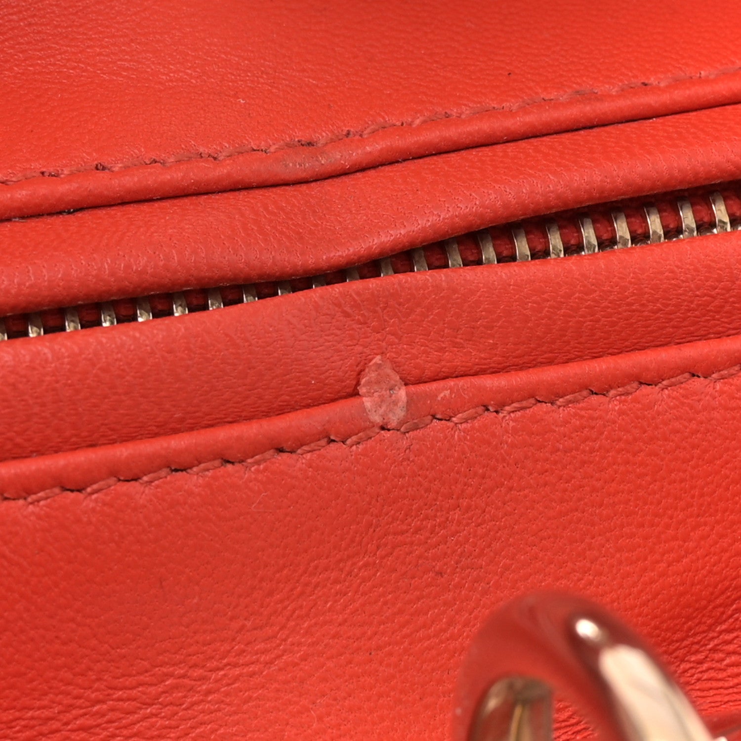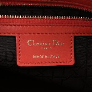 This is an authentic CHRISTIAN DIOR Lambskin Cannage Large Lady Dior in Orange. This chic tote is crafted of geometric quilted leather in orange. The bag features strong top handles and polished light gold hardware including a Dior initial charm. The top zipper opens to a black Dior jacquard fabric interior with a zipper pocket.