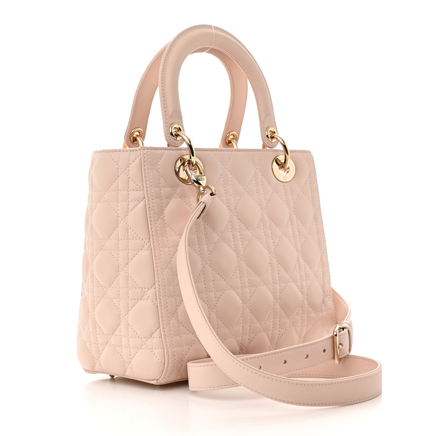 This is an authentic CHRISTIAN DIOR Lambskin Cannage Medium Lady Dior in Light Pink. This is crafted of geometric quilted lambskin leather in a light pink. The bag features sturdy leather top handles with polished gold hardware including hanging Dior initials logo charms. The top flap opens the bag to a pink suede interior with a zipper and patch pocket.