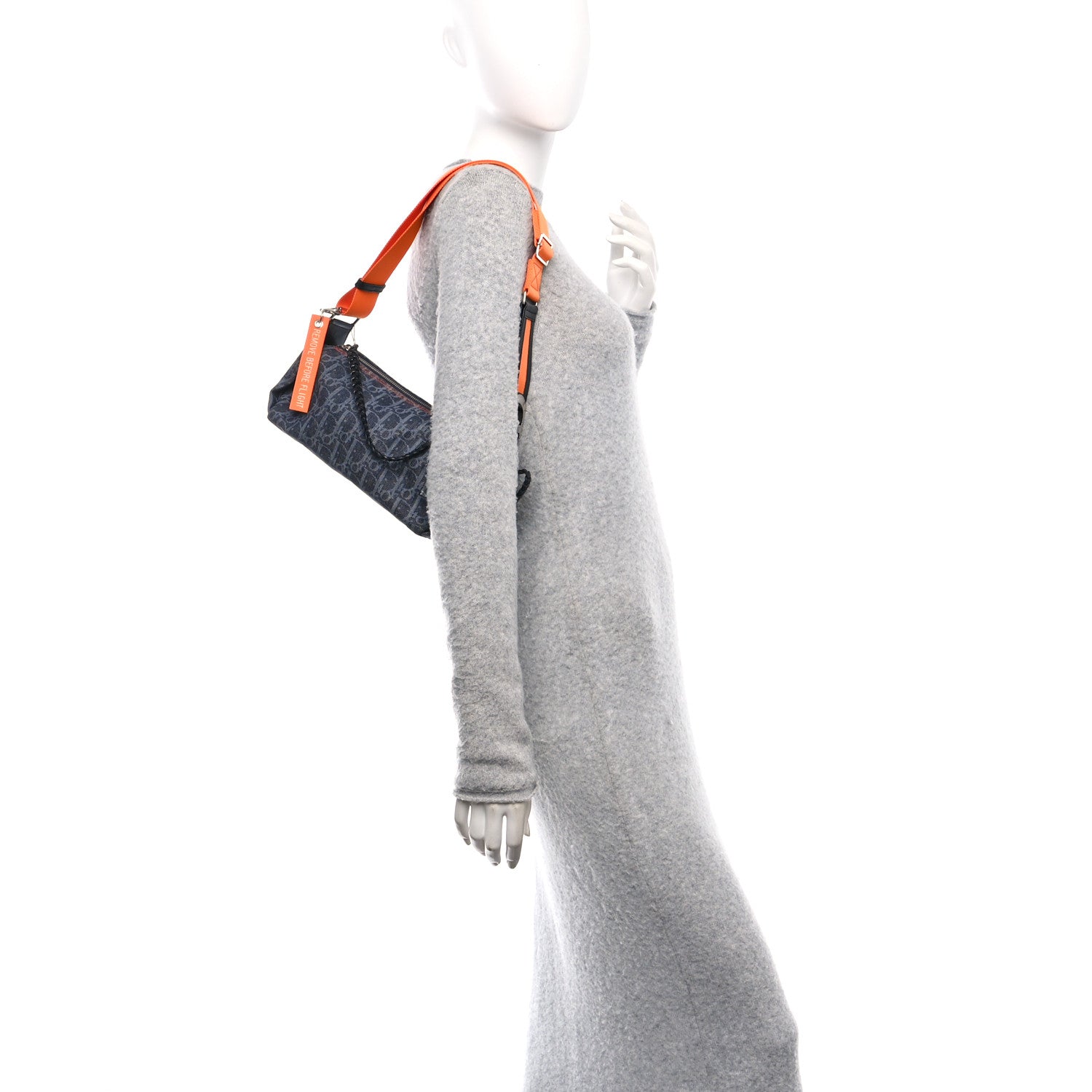 This is a guaranteed authentic CHRISTIAN DIOR Monogram Flight Shoulder Bag in Blue. This bag is done in a blue monogram canvas with orange nylon shoulder straps. The interior is done in blue nylon fabric and features a zipper pocket. This bag features silver hardware and a zip-top closure.