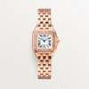Panthère de Cathtrtier watch, medium model, quartz movement. Case in rose gold 750/1000 set with brilliant-cut diamonds, dimensions: 27 mm x 36 mm, thickness: 6 mm, crown set with a diamond, silvered dial, blued-steel sword-shaped hands, rose gold 750/1000 bracelet. Water-resistant to 3 bar (approx. 30 meters).