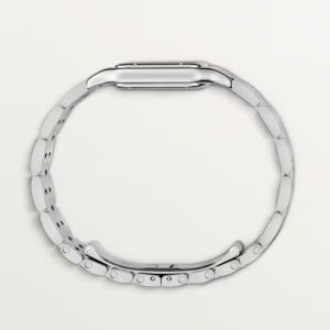 Panthère de Cathtrtier watch, medium model, quartz movement. Case in steel, dimensions: 27 mm x 37 mm, thickness: 6 mm, crown set with a synthetic blue spinel, silvered dial, blued-steel sword-shaped hands, steel bracelet. Water-resistant to 3 bar (approx. 30 meters).