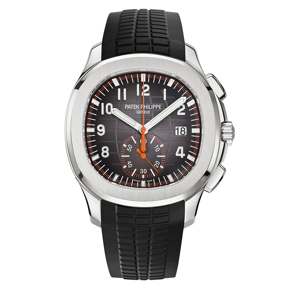 The sporty and very contemporary Aquanaut collection welcomes its first chronograph �C a complication that perfectly matches the character of this youthful and dynamic timepiece line. Endowed with a self-winding flyback chronograph movement, the Reference 5968 also stands out with remarkable aesthetic appeal, typified by orange chronograph displays contrasting against the black dial. It comes with two straps: one orange, one black, in an ultra-resistant composite material.