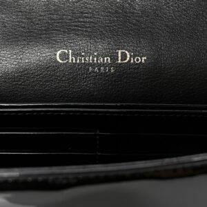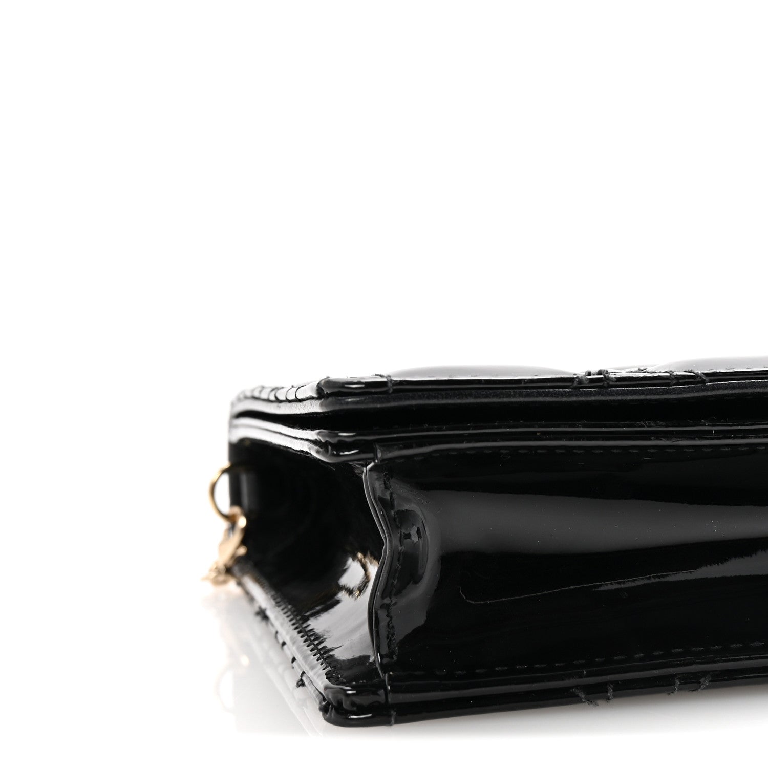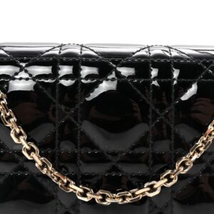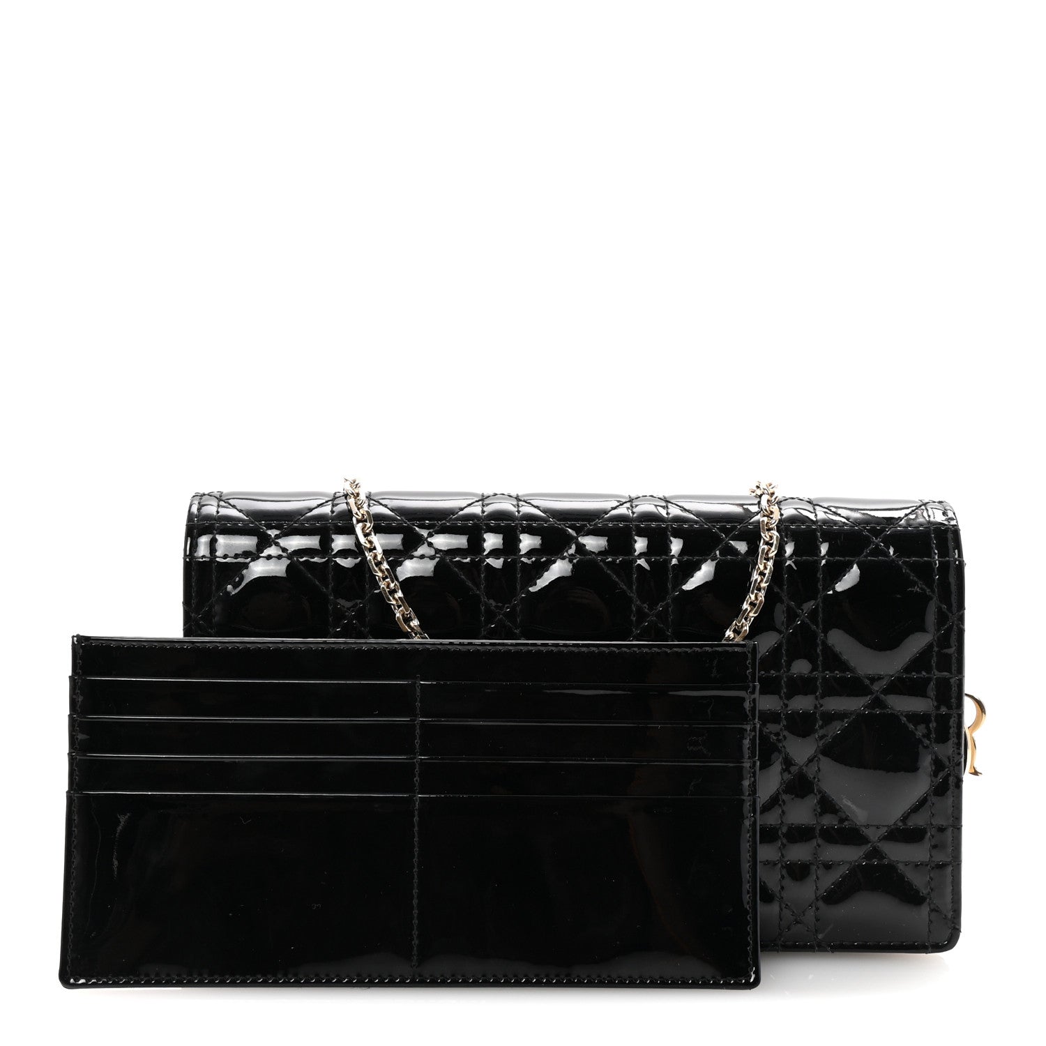 This is an authentic CHRISTIAN DIOR Patent Cannage LADY DIOR Clutch in Black. This wallet on a chain is crafted in geometric quilted patent leather in black. This wallet features a removable gold chain strap, and Dior letters bag charm. The front flap that opens to a leather interior with a patch pocket and a removable insert.