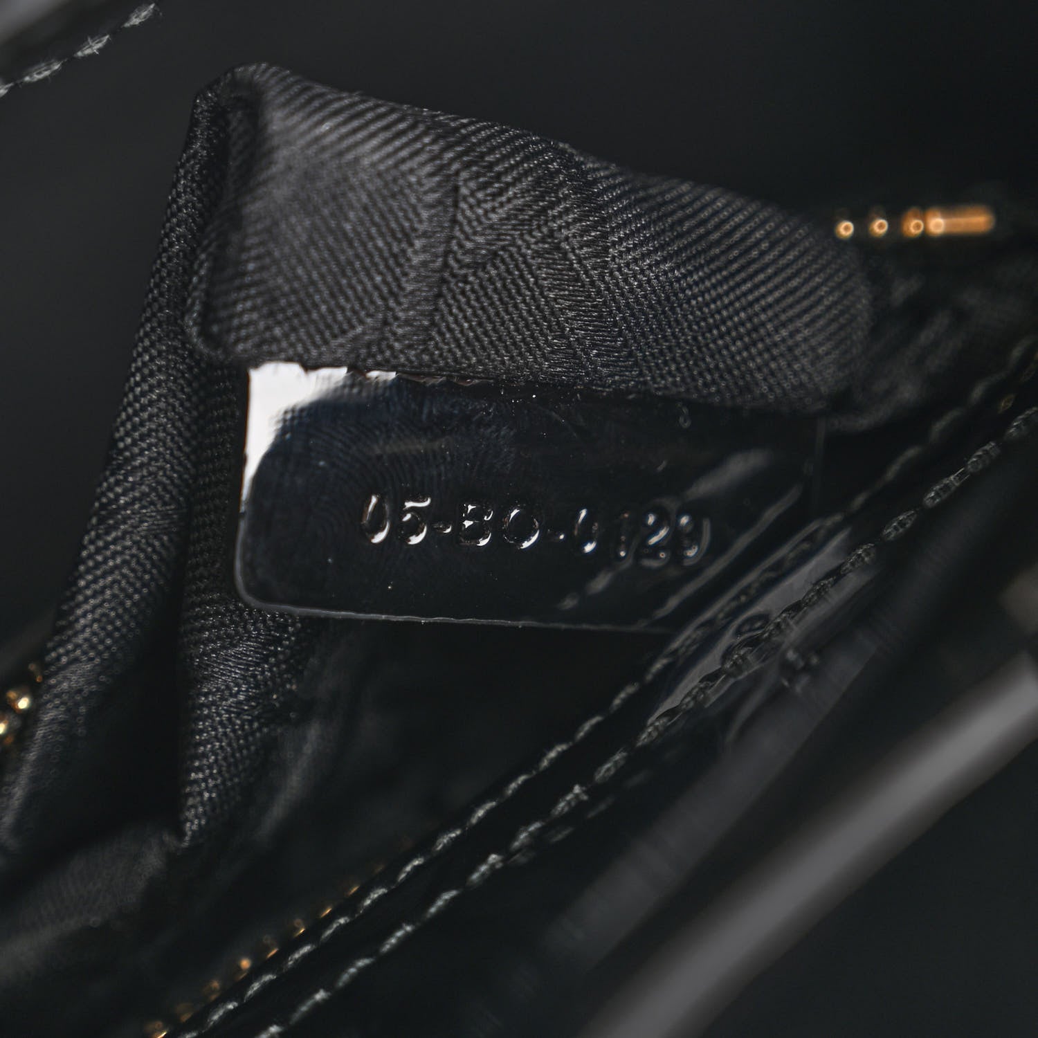 This is an authentic CHRISTIAN DIOR Patent Cannage Mini Lady Dior in Black. This mini tote is crafted of black patent leather with a geometric quilted design. The bag features smooth black patent leather top handles, a hanging “Dior” charm, and a removable chain strap with black leather shoulder pad and gold chain detail. The top flap opens to a black patterned fabric interior with a zipper pocket.