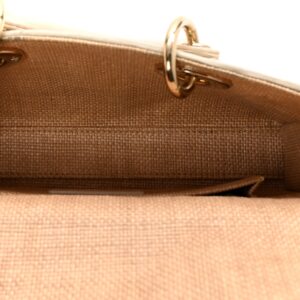 This is an authentic CHRISTIAN DIOR Raffia Macro Cannage Small Lady D-Joy in Latte. This attractive tote is crafted of a tweed textile in light brown with white leather trim. The bag features a removable shoulder strap, top leather handles, and light gold-tone hardware, including Dior letter charms. The top opens to a matching interior with a pocket.