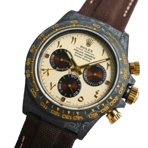 Encased in a 40 mm custom-designed carbon case, the watch presents a modern, rugged aesthetic while maintaining the classic Daytona appeal. The carbon construction not only enhances the watch’s durability but also reduces its weight, making it incredibly comfortable for daily wear. The unique desert-inspired theme is complemented by its distinct Arabic numeral hour markers, adding a cultural touch to the piece. These markers are designed in a bold, legible style that stands out against the matte dial, ensuring readability in any condition.