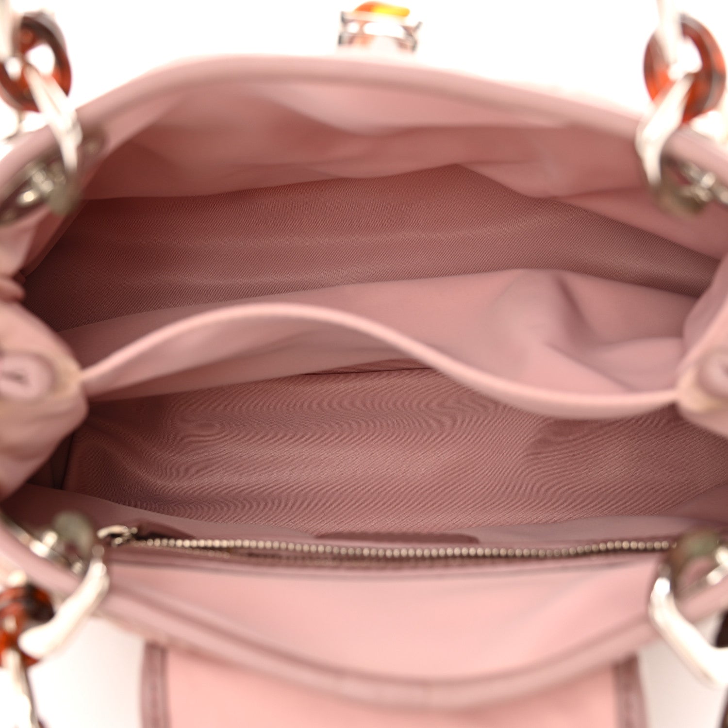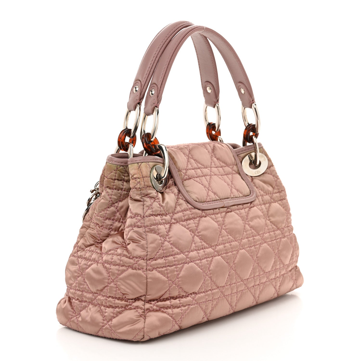 This is an authentic CHRISTIAN DIOR Satin Cannage Charming Lock in Pink. This chic tote features a pink satin fabric with a stunning geometric print, leather trim, leather top handles with silver chains, and a polished silver Christian Dior bag charm. This shoulder bag opens to a matching nylon fabric interior with a zipper pocket.