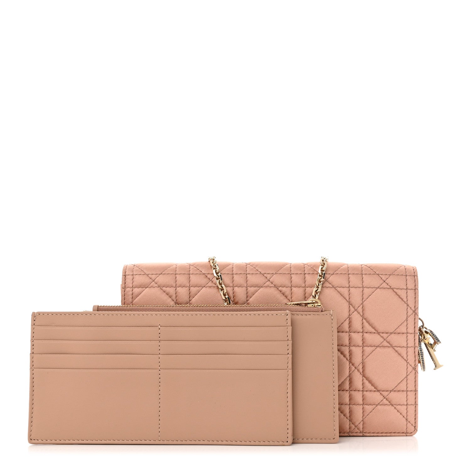 This is an authentic CHRISTIAN DIOR Satin Crystal Cannage Lady Dior Pouch in Nude. This stunning wallet on a chain is crafted of geometric quilted satin fabric in nude. The wallet on a chain features a removable gold chain strap with crystals, and a front flap that opens to a fabric interior with a patch pocket, a card slot insert and a zip pouch insert.