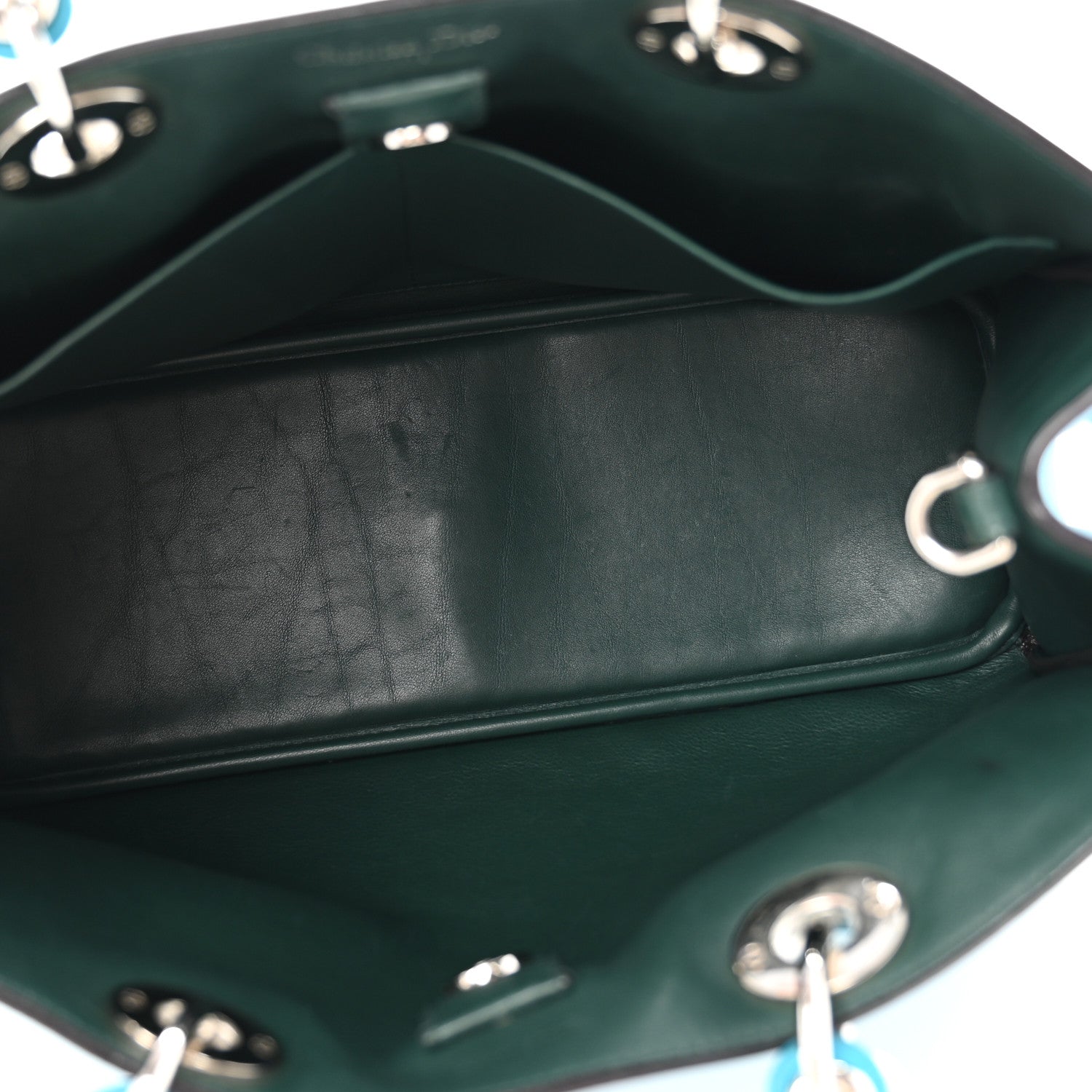 This is an authentic CHRISTIAN DIOR Smooth Calfskin Medium Diorissimo Tote in Light Blue. This stylish tote is crafted of smooth calfskin leather in blue. The bag features reinforced leather top handles, and an optional, adjustable shoulder strap with polished silver hardware including a hanging Dior initials charm. The top is open to a spacious green leather interior with patch pockets, and a removable pouch.