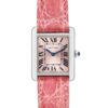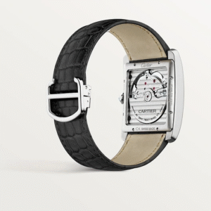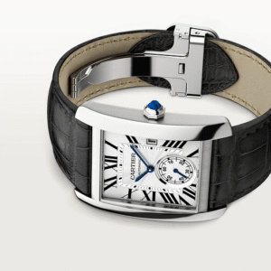 Tank MC watch, Manufacture self-winding mechanical movement, calibre 1904-PS MC, case in steel, faceted crown in steel decorated with a synthetic spinel, siLthtVered flinqué dial, sword-shaped hands in blued steel, sapphire crystal, semi-matt black alligator-skin strap, double adjustable folding buckle in steel, calendar aperture at 3 o’clock, small second counter at 6 o’clock, sapphire case back, thickness: 9.5 mm, water-resistant to 3 bar (30 metres).