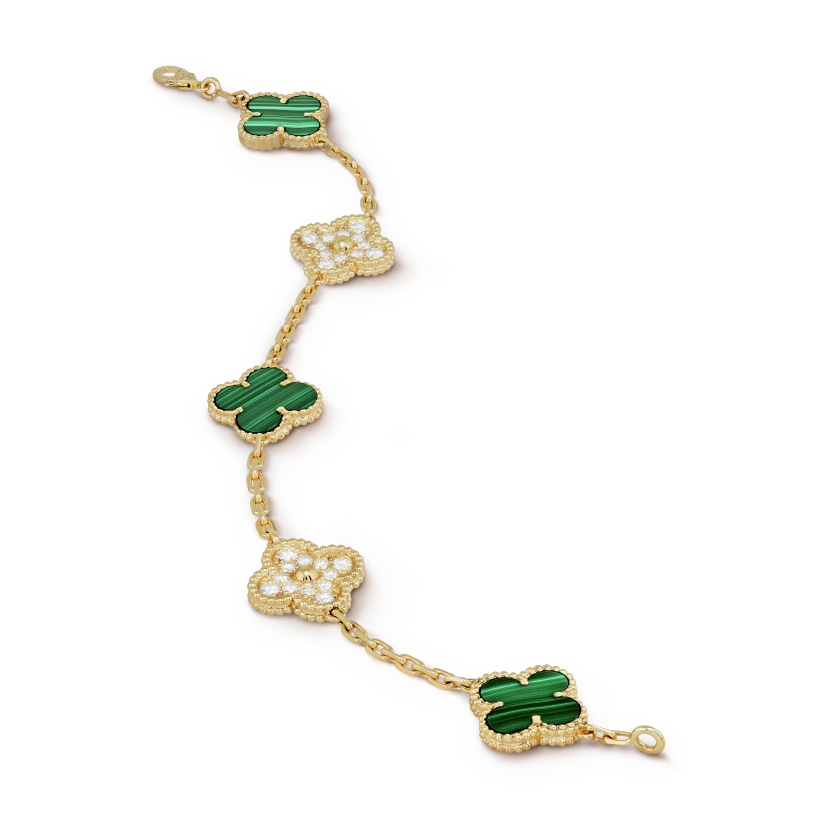Vintage Alhambra bracelet, 5 motifs, 18K yellow gold, malachite, round diamonds; diamond quality DEF, IF to VVS.